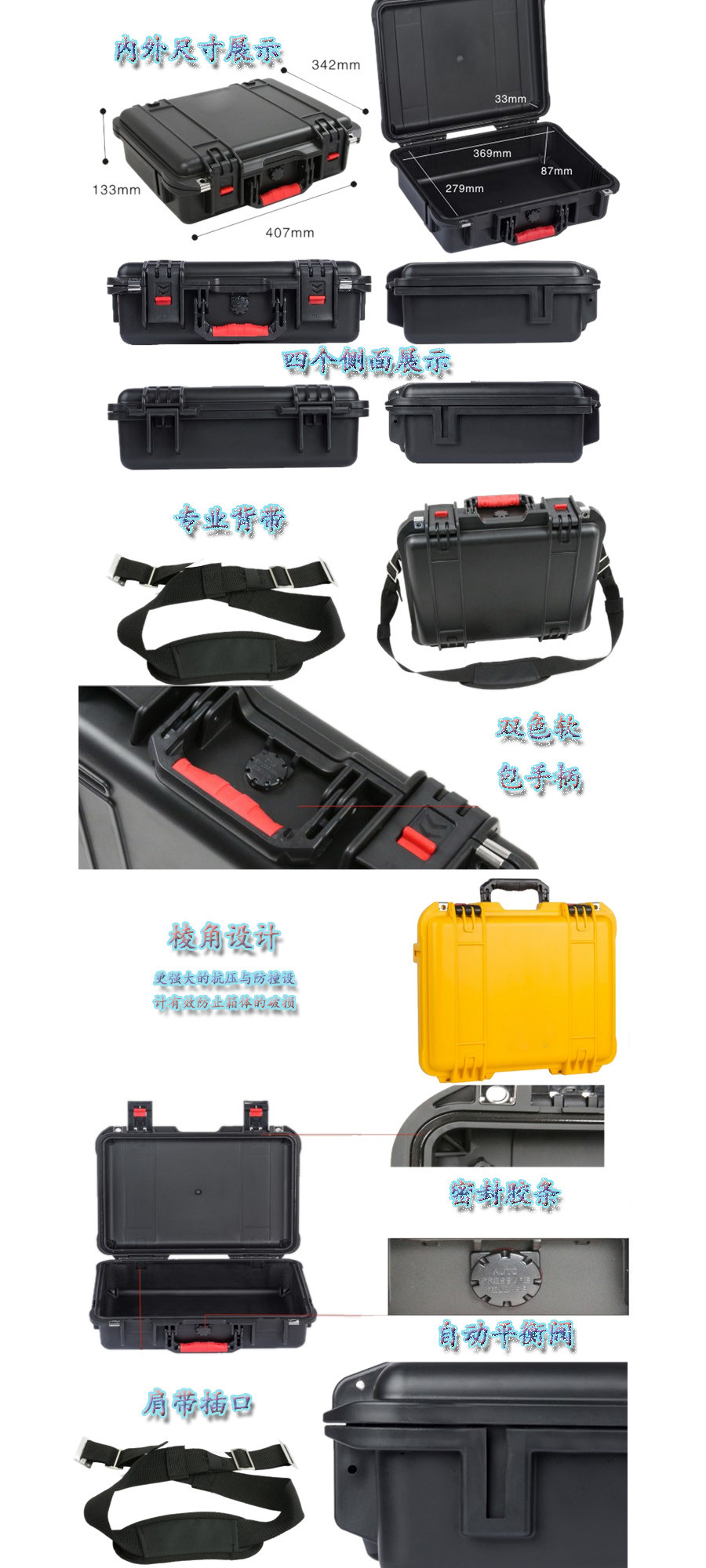 簡要說明:廣泛用于傳媒、公安、消防、軍隊、航空、戶外攝影、野外考察、科學(xué)探測等眾多領(lǐng)域的高端儀器、儀表。具有高強(qiáng)度、高抗壓沖擊、防潮、絕對密封、防塵、防水等特點。產(chǎn)品材質(zhì):ABS原料,箱體采用高抗沖擊的高分子聚合材料一體注塑成型,密封采用扁型彈性發(fā)泡密封橡膠條,確保防水氣密,所有較軸均采用不銹鋼材質(zhì)。